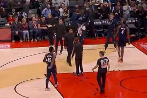 只退不防!篮网命中三分仍被哈特追身打成2+1 篮网喊停